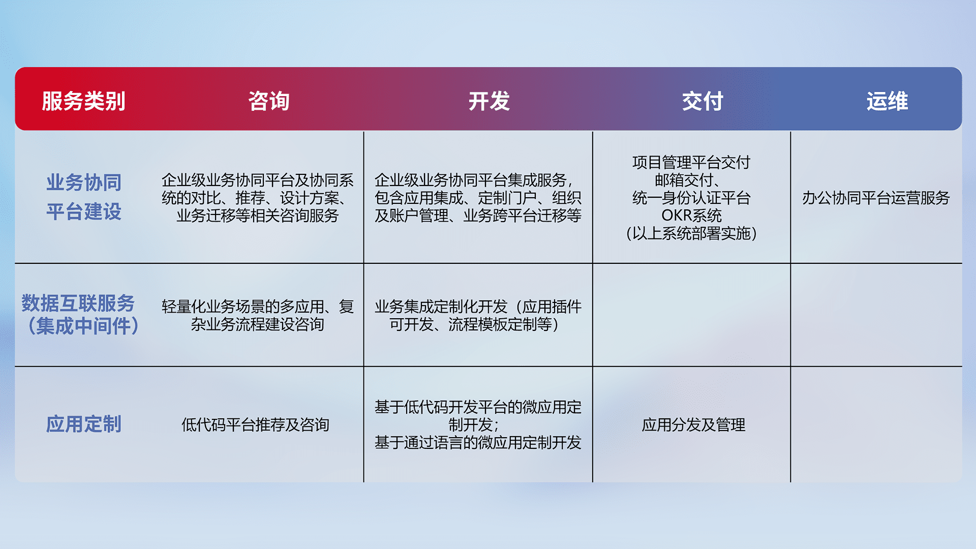 针对钉钉、、企微、、、IDaas等平台级产品提供产品的规划、、、方案、、、、交付、、、、定制化开发等服务,,,实现如统一协同办公、、、、智能客户服务、、、混合会议管理、、智能数据查询、、、、等业务场景,,,实现数字化转型。。。。